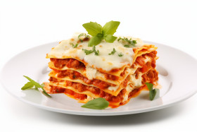 This photo showcases a mouth-watering serving of layered lasagna, its golden, melted cheese topping brilliantly highlighted against the bright white plate it rests on. The meticulous stacking of pasta, cheese, and a rich, meaty tomato sauce represents the harmony of flavors and textures that make Italian cuisine so beloved. Fresh green basil leaves adorn the top, adding a splash of color and hint of freshness to the decadent dish. The cheese is enticingly toasted at the edges, hinting at the culinary process of baking to achieve a cheese that is just as aesthetically pleasing as it is flavorful. The sauce's vibrant red peeks through the layers, suggesting a homemade and hearty meal that would be the centerpiece of any dining experience. The lighting enhances the shine on the cheese and the shadow cast below the lasagna gives it prominence and depth, emphasizing the dish's substantial size and the heartiness of the meal.