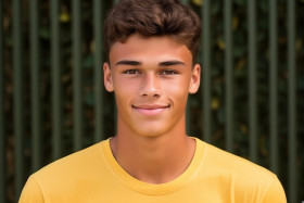 This photograph showcases a young person with a warm, approachable smile, giving off an air of confidence and contentment. The subject is wearing a bright yellow T-shirt that radiates a sense of vibrancy and energy, contrasting pleasantly with the green, geometric patterns of the backdrop which provide a naturalistic and calm environment. The focus is sharply on the face, capturing the subtle nuances of youthful skin and highlighting a pair of engaging, bright eyes that seem to directly connect with the viewer. The soft, outdoor lighting casts a gentle glow on the subject’s visage, promoting a look of health and vitality that complements the image's overall aesthetic. This visual narrative speaks to the bliss of young adulthood, the time of potentiality and the beginnings of self-discovery.