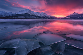 The scene unfolds in a serene, frozen wonderland where the icy surface of the lake gives way to jagged plates of translucent ice. These natural ice sculptures form an intricate mosaic, each unique in shape and texture, reflecting the last embers of daylight with a crystalline shimmer. Above, the twilight sky transitions into a dramatic canvas of fiery magenta and deepening blues, mirrored by the glass-like lake below. The rugged silhouette of a mountain range stands as a timeless backdrop, its peaks dusted in snow, contributing to the overall feeling of a grand, untouched wilderness. This play of color and form culminates in an awe-inspiring view that celebrates the raw beauty and power of the natural world. The contrast between the warm sky and the cool ice creates a dynamic visual that conjures a sense of tranquil yet passionate reflection.