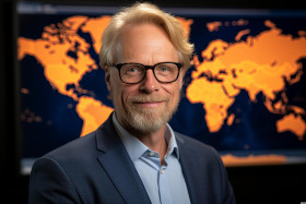 a professional headshot of a businessman with a world map in the background that gives a sense of international involvement and expertise, designed with rich colors and strategic focus, leaving space around the individual for editorial text or advertising copy