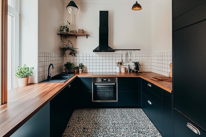 Sleek Modern Kitchen Interior with Navy Blue Cabinets