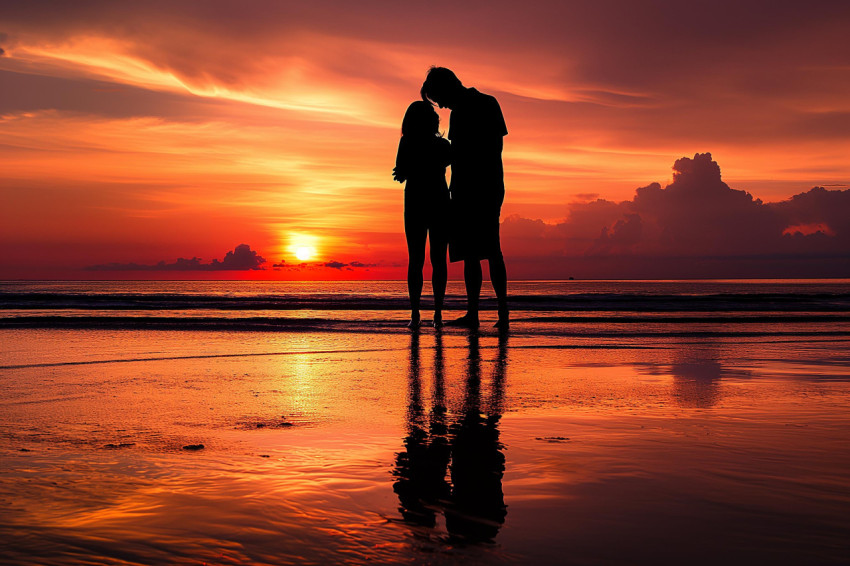 Silhouetted Couple Against a Sunset Reflected on Water