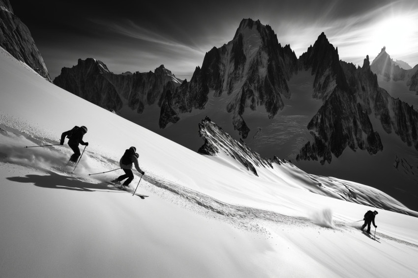 Dynamic Alpine Skiing Trio in a Mountainous Winter Wonderland