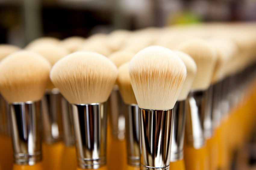 Assorted Makeup Brushes in a Wooden Holder Against a Soft Pink Backdrop