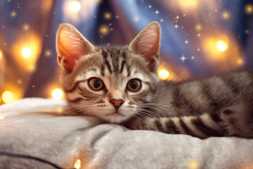 Cozy Kitten Nestled in Soft Blanket with Twinkling Lights