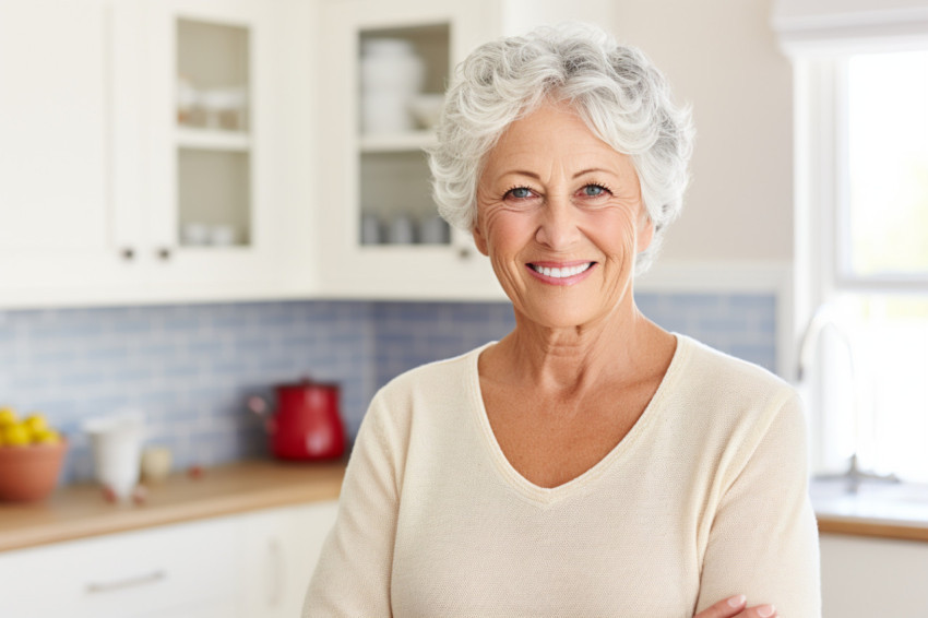 Portrait of a Smiling Senior Woman in a Bright Kitchen