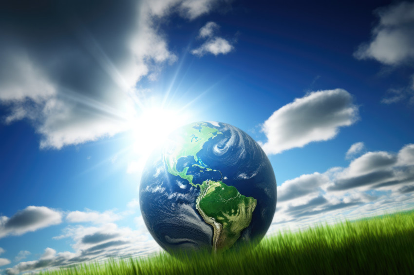 Surreal Depiction of Earth on a Grassy Plain Under a Radiant Sky
