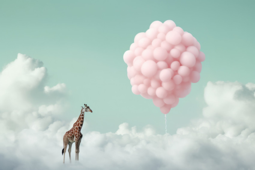 Surreal Composition of Giraffe and Balloons Above Clouds
