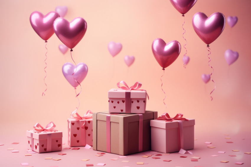 Valentine's Day Gifts and Heart Balloons on Pink