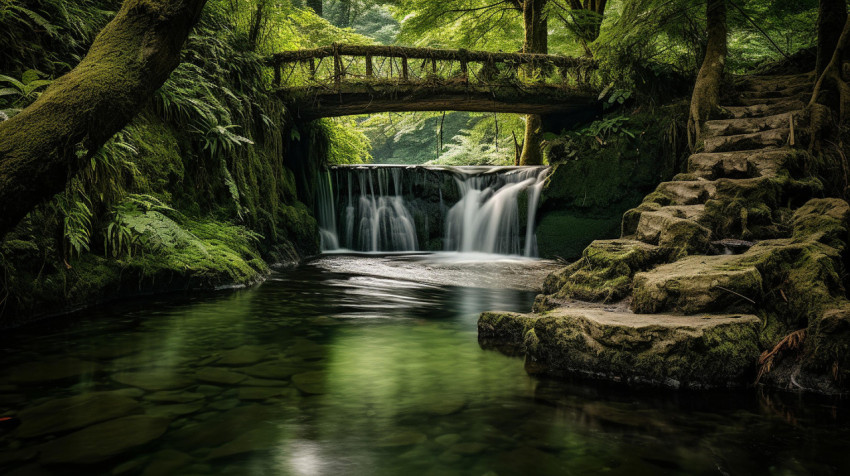 Enchanting Forest Waterfall and Wooden Bridge