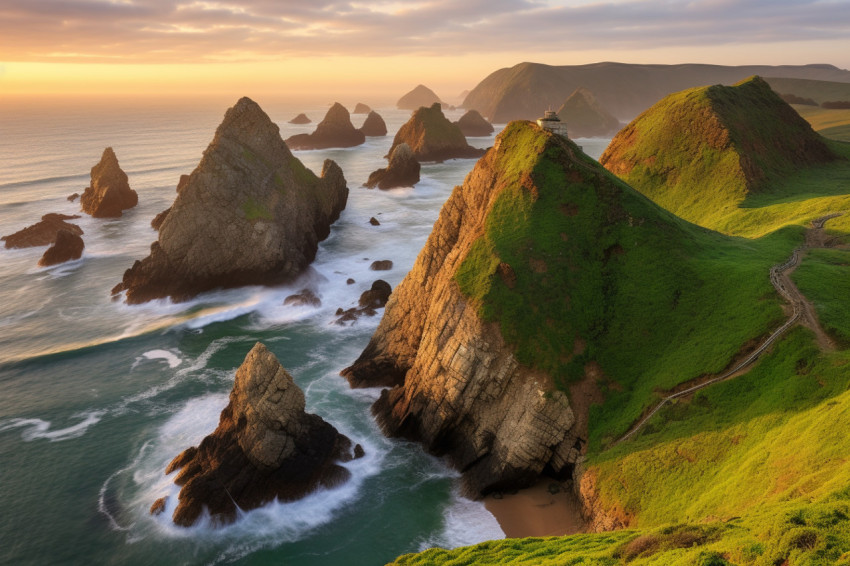 Enchanting Seascape with Lush Green Cliffs and Rock Formations at Sunset