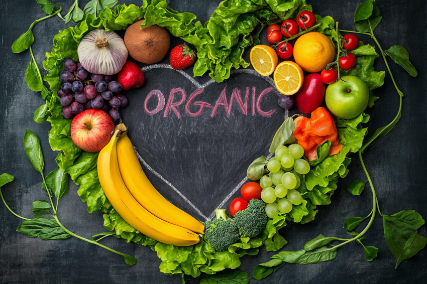 Heart-Shaped Assortment of Fresh Produce on Chalkboard Background