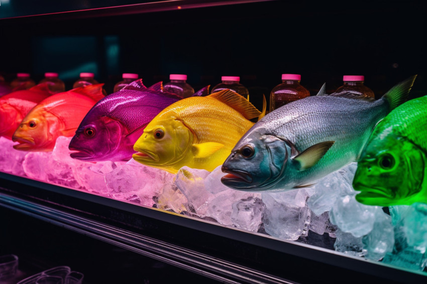 Surreal Display of Colorful Fish Bottles on Ice