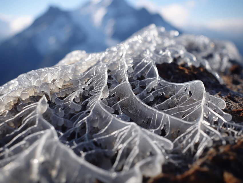 Fragile Elegance of Ice Patterns Against Mountain Backdrop